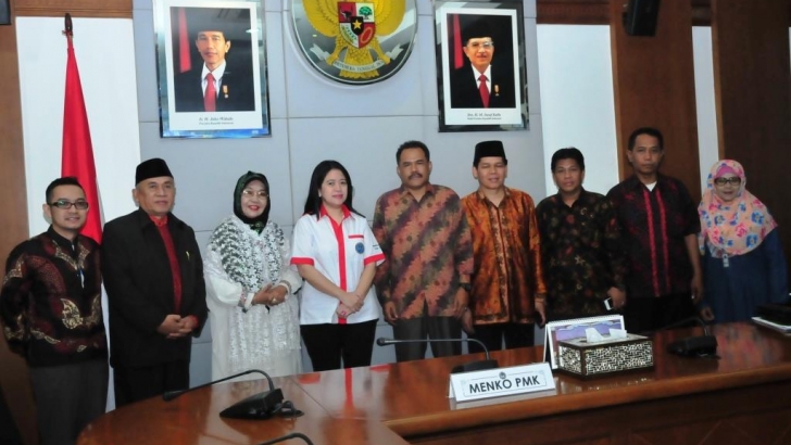 Jakarta, 26 Juni – Menko PMK Puan Maharani (keempat kiri) foto bersama usai menerima Pengurus Dewan Pengurus Nasional Generasi Muda Mesjid Indonesia (DPN GEMA-MI), Jumat, 26/6/2015 di ruang rapat menko PMK, Jl. Medan Merdeka Barat No.3, Jakarta. (Gs).
