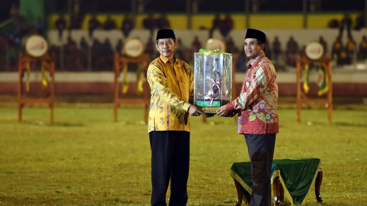 Jakarta (24/10) - Deputi Bidang Pendidikan dan Agama Agus Sartono (kanan) menyerahkan piala bergilir dari Juara Umum POSPENAS VI Kepada Ketua Panjatapnas POSPENAS di Stadion Maulana Yusuf, Serang Banten (22/10).