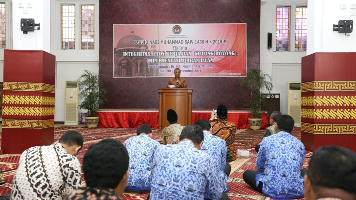 Jakarta ( 22/12) -- Deputi Bidang Koordinasi Pendidikan dan Agama Kementerian Koordinator Bidang Pembangunan Manusia dan Kebudayaan (Kemenko PMK) Agus Sartono, membuka acara Maulid Nabi Muhammad SAW 1438 H / 2016 M dengan tema : Intergritas, Etos Kerja dan Gotong Royong : Implementasi Ajaran Islam, di Aula Masjid Nurussalam, Kemenko PMK Jakarta.
