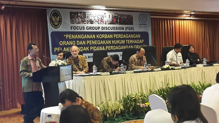 Focus Group Discusstion (FGD) Penanganan Korban Perdagangan Orang dan Penegakan Hukum terhadap Pelaku Tindak Pidana Perdagangan Orang (TPPO) diselenggarakan Kementerian Koordinator Politik Hukum dan Keamanan di Hotel Borobudur. Acara dibuka oleh Deputi V/Kamnas Kemenko Polhukam yang menghadirkan 5 (lima) pembicara yaitu Dubes Sujatmiko, Deputi Bidang Perlindungan Perempuan dan Anak Kemenko PMK; Akifah Elansari, Direktur KTKPM Kemensos; Umar Surya Fana, DITTIPIDUM, Bareskrim Polri; Faizal Chery Sidharta, Ditjen Multilateral Kementerian Luar Negeri, dan Mark Getchell, Pimpinan Kantor IOM di Indonesia