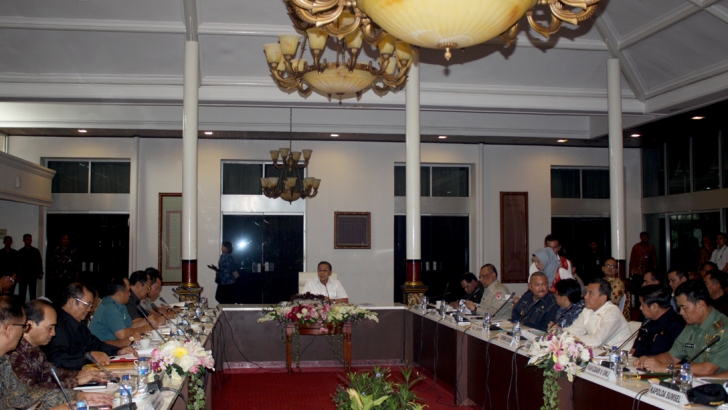 Palembang, 23 September 2014 - Wakil Presiden RI Boediono, memimpin Rapat Terbatas tentang Kebakaran Hutan dan Lahan di Gedung Griya Agung, Palembang, Sumatera Selatan. (ahmad)