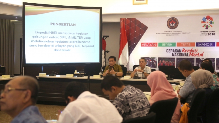 Jakarta (29/03) -- Deputi bidang Koordinasi Kerawanan Sosial dan Dampak Bencana Kemenko PMK, Masmun Yan Mangesa pagi ini memimpin rapat koordinasi (rakor) Dukungan Program/Kegiatan Ekspedisi NKRI Tahun 2017. Rakor yang merupakan lanjutan dari rakor pada 10 Februari 2017 lalu ini dilaksanakan dalam rangka memantapkan dukungan kegiatan dari sektor swasta, LSOM, dan BUMN pada Ekspedisi NKRI 2017. Pada kesempatan ini, Yan meminta peserta yang hadir untuk menyampaikan progress report dan bentuk nyata terkait dukungan program/kegiatan yang akan dilakukan.