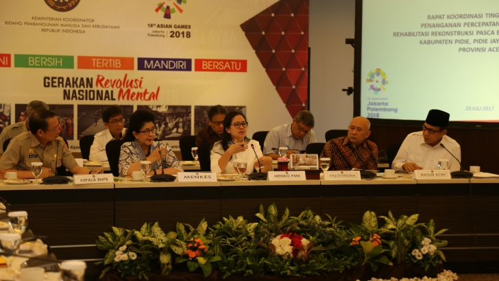 Jakarta (20/07)--- Menteri Koordinator Bidang Pembangunan Manusia dan Kebudayaan (Menko PMK), Puan Maharani memimpin rapat koordinasi (rakor) tingkat menteri (RTM) terkait penanganan percepatan pelaksanaan rehabilitasi dan rekonstruksi pasca gempa bumi di Kabupaten Pidie, Pidie Jaya dan Bireuen, Propinsi Nangro Aceh Darussalam (NAD) yang terjadi pada 7 Desember 2016 lalu. Hadir pada rakor kali ini Menteri Kesehatan Nila F.