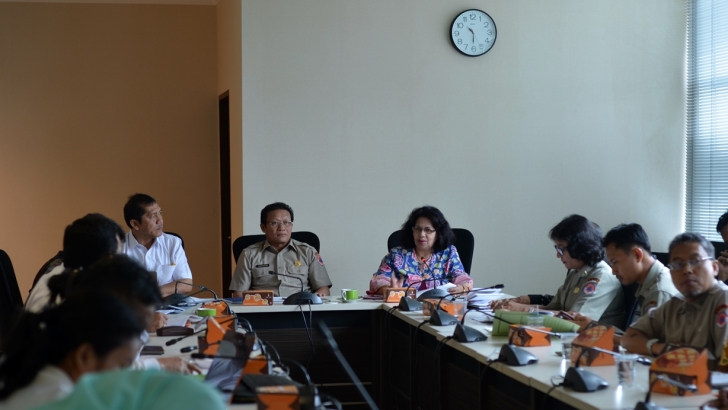 Jakarta (18/04) -- Asisten Deputi Bidang Penanganan Pasca Bencana Kemenko PMK Detty Rosita, didampingi oleh Asisten Deputi Bidang Tanggap Cepat Bencana Kemenko PMK Djoko Joewono memimpin Rapat Koordinasi Percepatan Penanganan Pelaksanaan Rehabilitasi dan Rekonstruksi Pasca Bencana Tsunami Mentawai, Banjir Bandang Manado dan Erupsi gunung Sinabung. di Kantor Kemenko PMK, Jakarta (18/04). Rapat kali ini menindaklanjuti hasil Rakor di Pemprov.
