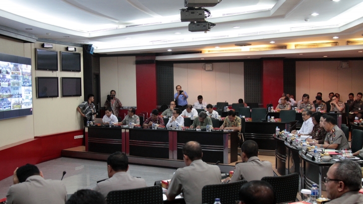 Jakarta (24/10) --- Deputi bidang Koordinasi Kerawanan Sosial dan Dampak Bencana Kemenko PMK, Masmun Yan Mangesa, siang ini memimpin rapat koordinasi pengembangan sistem peringatan dini multi ancaman atau Multi Hazard Early Warning System (MHEWS). Rakor yang diadakan di ruang rapat utama Kemenko PMK ini dihadiri oleh K/L terkait seperti BNPB, BPPT, BMKG dan lainnya.