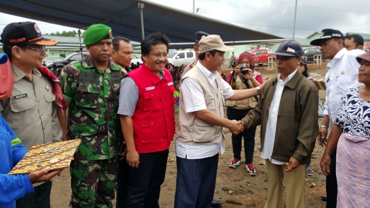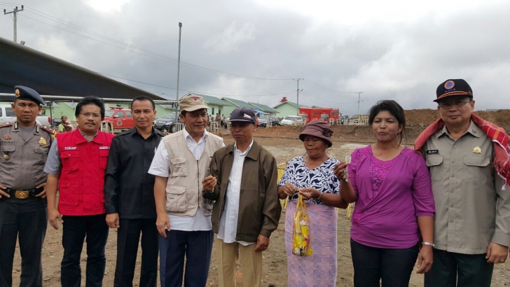 Kab. Karo, 10 Desember 2015 - Kepala Badan Nasional Penanggulangan Bencana (BNPB) Williem Rampangilei, didampingi Bupati Karo Terkelin Brahmana dan Asdep Tanggap Cepat Becana Togap Simangunsong, memberikan secara simbolis kunci rumah hunian tetap kepada korabn erupsi Gunung Sinabung di Kab. Karo, Sumatera Utara. Pemberian Rumah Hunian Tetap tahap I diberikan kepada 370 kk, sedangkan tahap II akan diberikan kepada 1683 KK. (kedeputian I/Humas)