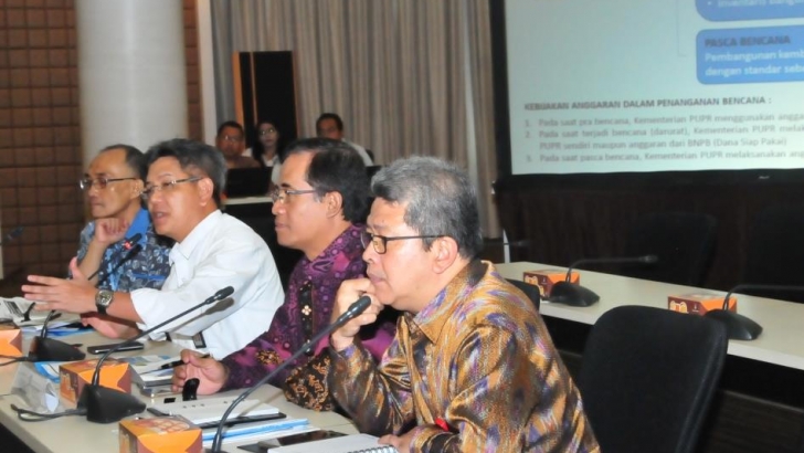 Jakarta, 23 Desember 2015 - Asisten Deputi Tanggap Cepat Bencana pada Deputi Bidang Koordinasi Kerawanan Sosial dan Dampak Bencana Kemenko PMK Togap Simangunsong (kedua kiri) didampingi Asisten Deputi Penanganan Pasca Bencana Djoko Joewono (kiri), memimpin Focus Group Discussion tentang siaga darurat penanganan banjir dan tanah longsor serta untuk penguatan koordinasi penanganan bencana, Rabu, 23/12. (foto;humaskemenkopmk/ng)
