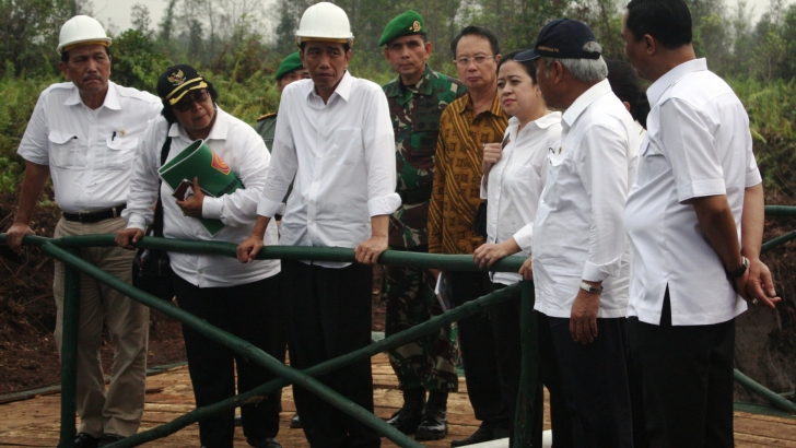 Palangkaraya (31/10) - Menteri Koordinator Pembangunan Munusia dan Kebudayaan (Kemenko PMK), Puan Maharani mendampingi Presiden Joko Widodo bersamaMenko Polhukam Luhut Panjaitan, Menteri LHK Siti Nurbaya dan Menteri PU dan Perumahan Rakyat Basuki Hadi Muljono saat meninjau blocking kanal yang dibangun untuk mencegah terjadinya kebakaran lahan gambut di desa Tumbang Nusa, Kabupaten Pulang Pisau, Kalteng, Sabtu (31/10).