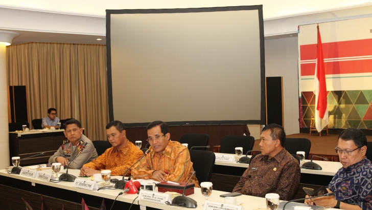Jakarta (22/1) - Plt Sekretaris Kementerian Koordinator Prof R. Agus Sartono memberikan keterangan pers sesuai Rapat Koordinasi Penanganan Eks Anggota Gafatar di Kalimantan Barat yang berlangsung di Ruang Rapat Utama Kemenko PMK, Jakarta. Turut mendampingi dalam memberikan keterangan pers Sesmenko Polhukam, Dirjen Linjamsos Kementerian Sosial, Dirjen Pol Pum Kemendagri, dan Asisten Operasi Kapolri. (humas/dwi)
