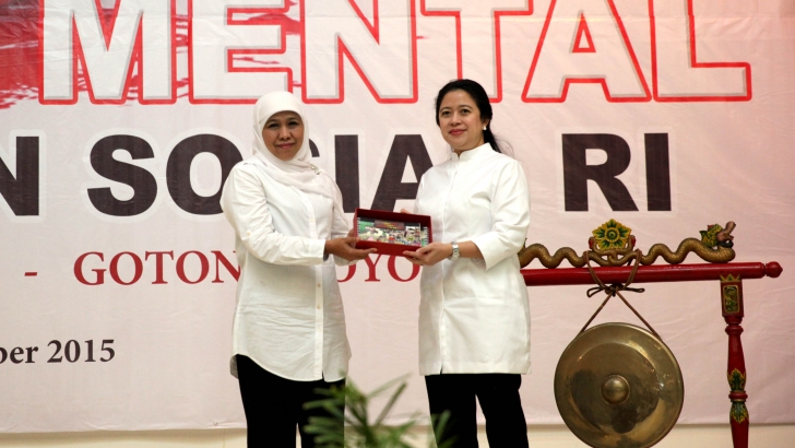 Jakarta, 16 Desember 2015 - Menteri Koordinator Bidang Pembangunan Manusia dan Kebudayaan Puan Maharani (kanan) menerima buku Karikatur Budaya Restorasi Sosial yang diberikan oleh Menteri Sosial Khofifah Indar Parawansa (kiri) pada acara Pencanangan dan Sosialisasi Gerakan Nasional Revolusi Mental di Kementerian Sosial, Rabu (16/12). (foto:humaskemenkopmk/ng)