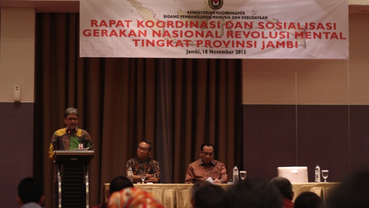 Jambi, 19 November 2015 - Asisten Deputi Kepemudaan Kemenko PMK Suarmansyah saat memberikan kata sambutan dalam acara pembukaan Rapat Koordinasi dan Sosialisasi Gerakan Nasional Revolusi Mental tingkat Provinsi Jambi pada Rabu Malam 18/11/2015 di Hotel Aston.