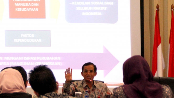 Jakarta, 27 Oktober 2015 - Anggota Tim Kelompok Kerja (Pokja) Revolusi Mental Kementeran Koordinator Bidang Pembangunan Manusia dan Kebudayaan (Kemenko PMK) Ahmad Mukhlis Yusuf menyampaikan materi mengenai sosialisasi gerakan revolusi mental. Kegiatan tersebut merupakan rangkaian kegiatan Focus Group Discussion (FGD) Penyusunan Peta Jalan Revolusi Mental yang diselenggrakan oleh Pokja RM Kemenko PMK pada Selasa (27/10/2015) di Jakarta. Tampak juga di depan, Wakil Sekretaris Tim Penyusun Peta Jalan Revolusi Mental Kemenko PMK Haswan.