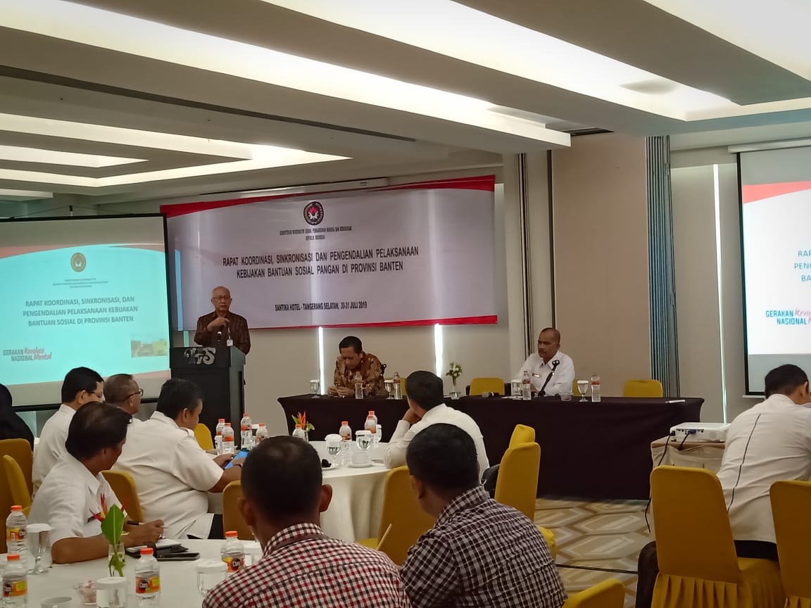 Tangerang Selatan (31/7) - Deputi Bidang Koordinasi Penanggulangan Kemiskinan dan Perlindungan Sosial Kemenko PMK, Tb. A. Choesni memberikan arahan dalam Rapat Koordinasi, Sinkronisasi, dan Pengendalian Pelaksanaan Kebijakan Bantuan Sosial Pangan di Provinsi Banten. Rapat dilaksanakan di Hotel Santika BSD City, Serpong.