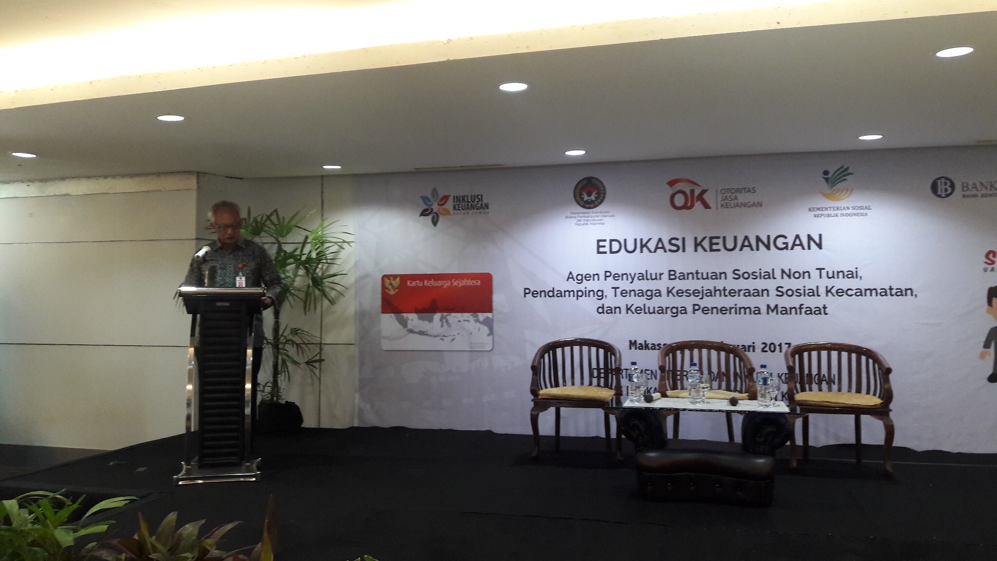 Makassar (21/02)--- Deputi bidang Koordinasi Penanggulangan Kemiskinan dan Perlindungan Sosial, Tb Achmad Choesni, pagi ini menjadi Pembicara Tamu di tengah forum Edukasi Keuangan bagi Penyalur BPNT, Pendamping dan Keluarga Penerima Manfaat (KPM) di gedung Graha Pena, Kota Makassar. Acara ini merupakan bentuk sosialisasi penyaluran BPNT dan sepenuhnya diselenggarakan oleh Otoritas Jasa Keuangan. Sosialisasi masif semacam ini sebelumnya telah diputuskan bersama dalam Rapat Tingkat Menteri tentang Bantuan Pangan Non Tunai (BPNT) pada 8 November 2016 lalu. OJK, Bank Indonesia, dan Kementerian Komunikasi dan Informasi diminta aktif menyosialisasikan program bantuan pangan bagi masyarakat berpenghasilan paling rendah lewat hasil desain ulang ini.