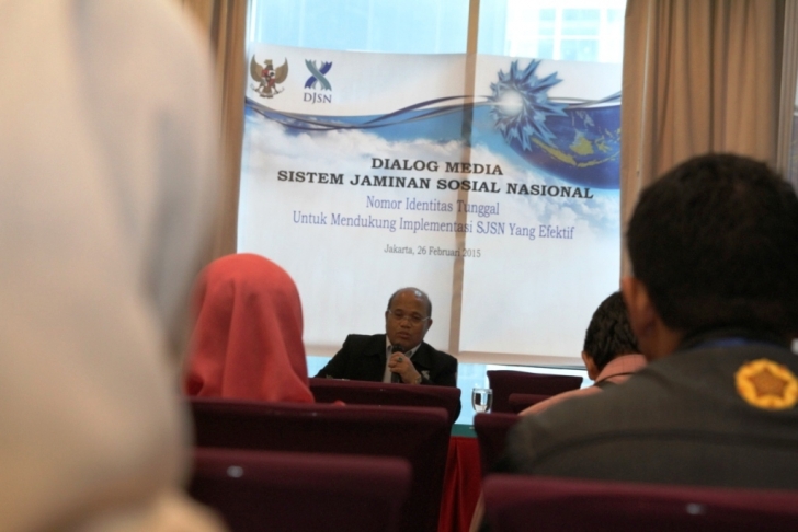 Jakarta, 26 Februari - Ketua Dewan Jaminan Sosial Nasional Chazali Situmorang, tengah menjelaskan pentingnya penggunaan Nomor Identitas Tunggal (NIK) untuk mendukung implementasi Sistem Jaminan Sosial Nasional (SJSN) yang efektif kepada media di Hotel Manhattan, Jakarta, Kamis (26/02/2015). (MJ)