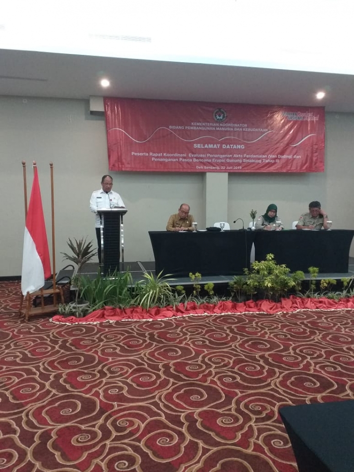 Medan (22/07) — Deputi Bidang Koordinasi Kerawanan Sosial dan Dampak Bencana Kemenko PMK, Dody Usodo HGS, membuka Rapat Koordinasi (Rakor) Evaluasi Penanganan Akta Perdamaian (Van Dading) dan Penanganan Pasca Bencana Erupsi Gunung Sinabung Tahap III di Provinsi Sumatera Utara pada Senin (22/07). Rakor dilaksanakan di Hotel Prime Plaza, Deli Serdang.