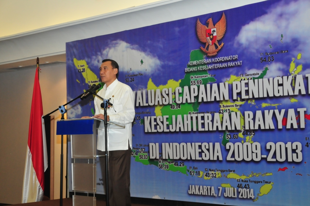 Jakarta, 7 Juli – Menko Kesra HR. Agung laksono yang diwakili Sesmenko Kesra Drs. Sugihartatmo, MPIA membuka secara resmi Evaluasi Capaian Peningkatan Kesejahteraan Rakyat Di Indonesia 2009 – 2013, Senin (7/7/2014) Di Kemenko Kesra, Jl. Medan Merdeka Barat No.3, Jakarta.