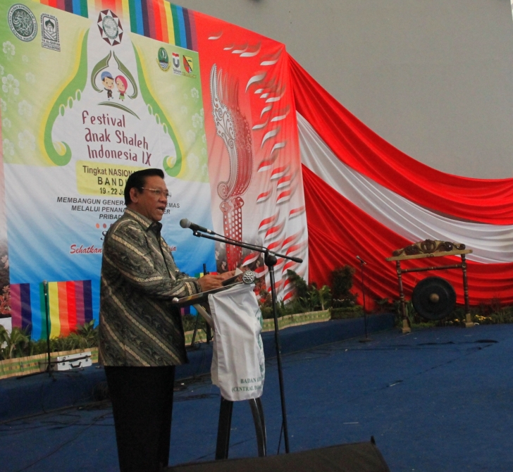 Bandung, 21 Juni 2014 - Menko Kesra, HR. Agung Laksono memberikan sambutan pada acara Pembukaan Festival Anak Shaleh Indonesia IX Tingkat Nasional 2014, yang diselenggarakan oleh Badan Komunikasi Pemuda Remaja Masjid Indonesia (BKPRMI) di Telkom University Convention Hall.