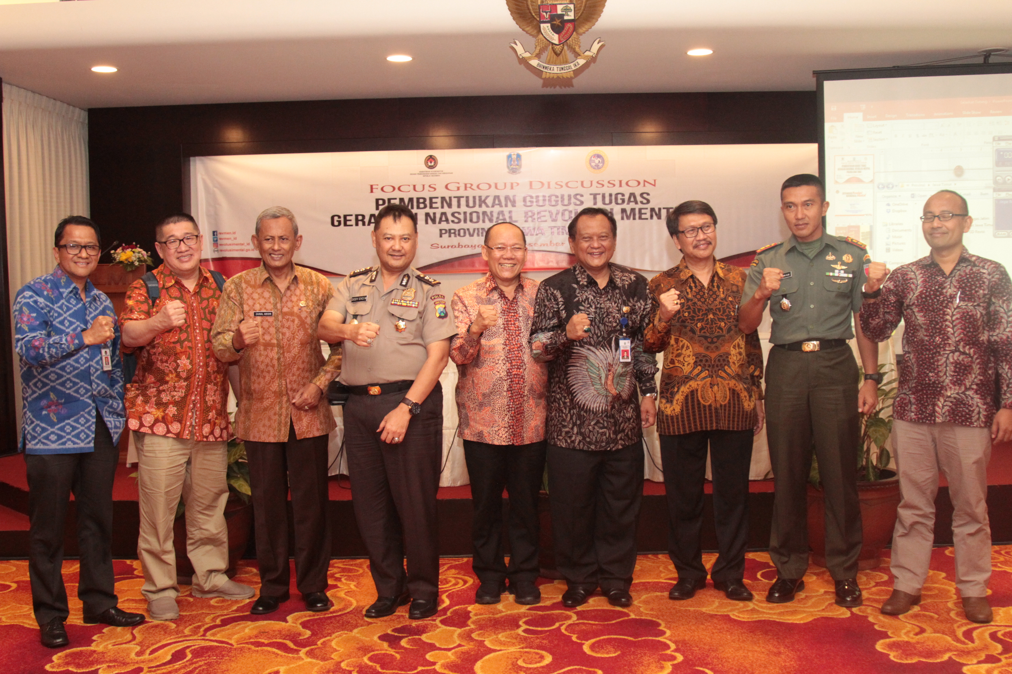 Surabaya (23/12)—Kementerian Koordinator Bidang Pembangunan Manusia dan Kebudayaan (Kemenko PMK) yang diwakili Sekretaris Dewan Jaminan Sosial Nasional (DJSN), Pudjo Hadijanto; Asisten Deputi Bidang Kepemudaan, Redemtus Alfredo Sani Fenat; dan Anggota Kelompok Kerja Revolusi Mental (Pokja Revmen), Paulus Wirutomo, hari ini menggelar Focus Group Discussion (FGD) untuk membahas pembentukan Gugus Tugas Gerakan Nasional Revolusi Mental di Provinsi Jawa Timur. Peserta yang hadir dalam forum diskusi kelompok ini berjumlah 102 orang terdiri atas para penyelenggara negara, pendidik, budayawan/seniman, tokoh masyarakat, organisasi profesi, pemuda dan mahasiswa, netizen, penyandang disabilitas dan juga dari dunia usaha.