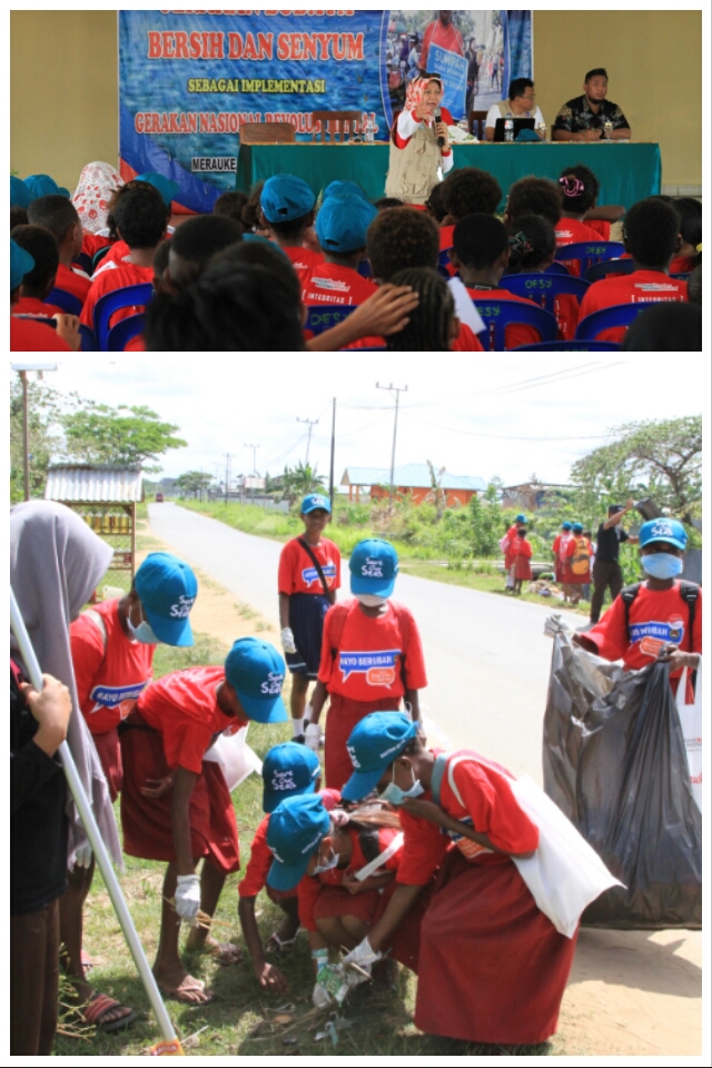 Merauke, Papua (25/10)--- Setelah awal Oktober lalu resmi dimulai di Tapanuli Utara, Sumut, Gerakan Budaya Bersih dan Senyum (GBBS) hari ini kembali digelar di Kab Merauke, Papua. Kegiatan ini merupakan hasil inisiasi dari kerja koordinasi, sinkronisasi dan pengendalian Kemenko PMK bersama Kemenko Maritim, Kementerian Pendidikan dan Kebudayaan, Kementerian Lingkungan Hidup dan Kehutanan, Dinas Pendidikan dan Pengajaran Kabupaten Merauke serta Dinas Lingkungan Hidup Kab Merauke. Kegiatan yang berpusat di Aula Kolese Pendidikan Guru (KPG) Khas Papua, ini dibuka oleh Sekda Kab Merauke, Daniel Pauta, yang mewakili Bupati Merauke. Acara pembukaan GBBS ini dihadiri pula oleh Anggota DPRD Kab Merauke, jajaran SKPD se-Kab Merauke, Perwakilan Rektorat Universitas Negeri Musamus Merauke, para kepala distrik, para siswa sekolah se-Kab Merauke, para guru sekolah, anggota komunitas dan relawan serta media massa.