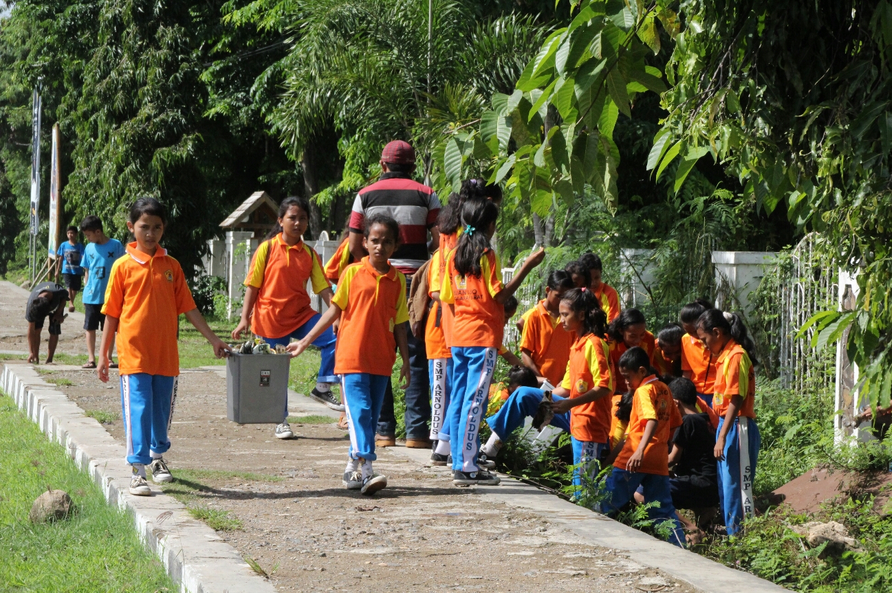 Setelahnya, para siswa/siswi yang dibantu para guru melakukan aksi bersih-bersih jalan serta mengumpulkan sampah di lingkungan sekolah serta di jalan sekitar sekolah. Dalam acara yang berlangsung meriah ini, Tim Sekretariat Revolusi Mental juga membawa bantuan untuk digunakan di sekolah, terdiri dari cat tembok, sapu, serta tempat sampah. (olv/IN)