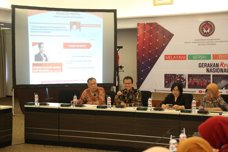 Jakarta (08/09)--- Deputi bidang Koordinasi Perlindungan Perempuan dan Anak Kemenko PMK, Sujatmiko, pagi ini menggelar rapat koordinasi mengenai Pembangunan Keluarga Berkarakter sebagai Implementasi GerakanNasional Revolusi Mental di Ruang Rapat Utama lt.7 Kemenko PMK, Jakarta. Rakor ini dihadiri oleh Ketua Yayasan Karakter Elling Indonesia, Melly Kiong, dan perwakilan dari Kementerian dan Lembaga (K/L) di antaranya Kemendagri, Kemensos, BKKBN, dan lainnya.