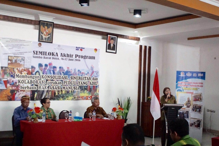 Tambolaka (16/06)--- Asisten Deputi bidang Koordinasi Pemberdayaan Masyarakat pada Kedeputian bidang Koordinasi Pemberdayaan Masyarakat, Desa, dan Kawasan Kemenko PMK, Magdalena, berkesempatan membuka acara Semiloka Akhir Program yang kali ini berthema “Membangun Konsolidasi, Sinergitas dan Kolaborasi Gerakan Peduli yang Adil Berdasar Hal Azasi Manusia.”Acara ini di inisiasi oleh Mitra Program Peduli, Yayasan Donders, bekerjasama dengan Pemda Kab Sumba Barat Daya, NTT. Di Kab. Sumba Barat daya sendiri terfokus kepada pemberdayaan dan advokasi hak anak anak buruh migran yang tergolong sebagai Anak Remaja Rentan.