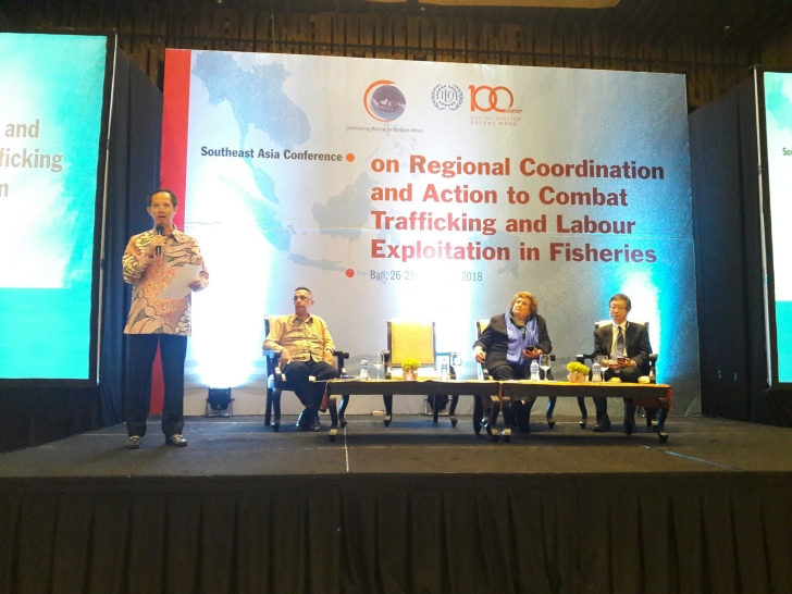 Bali, 29 November 2018. Plt. Deputi Bidang Koordinasi Perlindungan Perempuan dan Anak, Ghafur Dharmaputra menyampaikan sambutan penutupan pada acara Southeast Asia (SEA) Conference on Regional Coordination and Action to Combat Trafficking and Labour Exploitation in Fisheries (SEA Conference) yang dilaksanakan di Bali, 26-29 November 2018. Konferensi ini merupakan kelanjutan dari Consultative Forum on Regional Cooperation against Human Trafficking, Labour Exploitation and Slavery at SEA yang diadakan pada Maret 2018 di Bali.