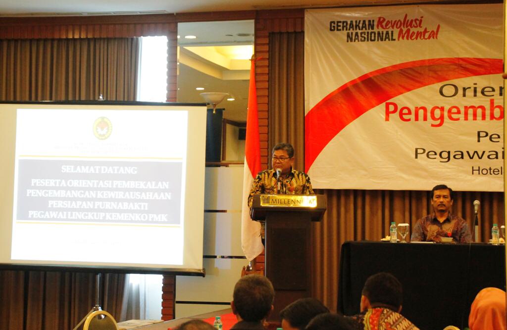 Jakarta (22/08)--- Masih dalam thema yang sama dalam Peringatan Hari Kemerdekaan ke-74 tahun Republik Indonesia yaitu “SDM Unggul untuk Indonesia Maju,” Kemenko PMK menggelar kegiatan pengembangan kapasitas kewirausahaan khususnya untuk para pegawai di lingkungan Kemenko PMK terutama kepada mereka yang tidak lama lagi akan memasuki masa purnatugas. Kegiatan orientasi pengembangan kapasitas kewirausahaan pegawai di lingkup Kemenko PMK ini menurut Ketua Panitia Kegiatan yaitu Koordinator Gerakan Kemenko PMK Mandiri yang juga Asisten Deputi Pemberdayaan Disabilitas dan Lansia, Kemenko PMK, Ade Rustama merupakan salah satu program kerja Gerakan Kemenko PMK Mandiri yang dalam pelaksanaannya bersinergi dengan keempat gerakan yang lain sebagai wujud dari semangat dan nilai Gerakan Nasional Revolusi Mental yaitu Gerakan Kemenko PMK Melayani, Kemenko PMK Bersih, Kemenko PMK Bersatu, dan Kemenko PMK Tertib.