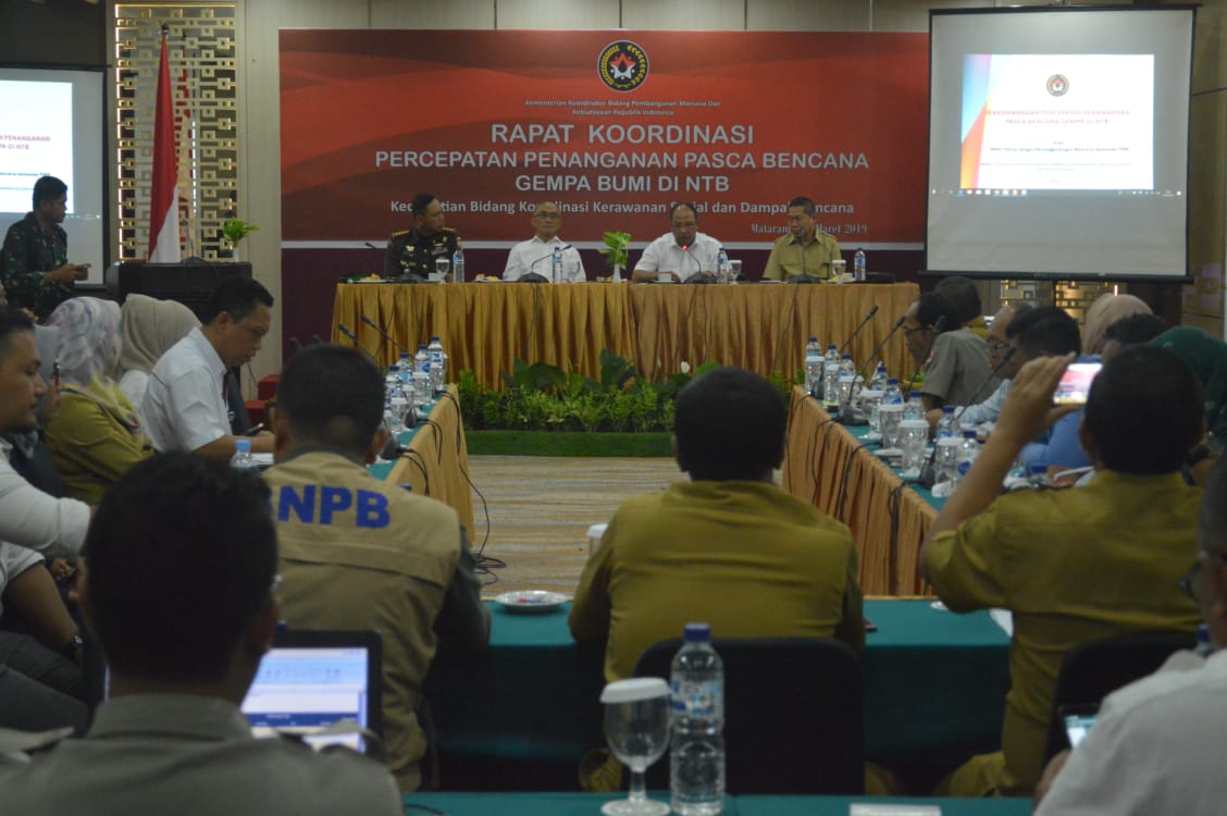 Mataram (25/3) -- Pada tanggal 22 Maret 2019 lalu, Presiden Joko Widodo menginstruksikan agar pembangunan rumah dan segala kebutuhan penunjangnya bagi korban terdampak bencana gempa bumi di Provinsi Nusa Tenggara Barat (NTB) agar segera diselesaikan. Demikian disampaikan Wakil Ketua Satuan Tugas Penanggulangan Bencana Kemenko PMK, Dody Usodo Agro mengawali arahannya pada rapat koordinasi Perkembangan Percepatan Penanganan Pasca Bencana Gempa di NTB yang dilaksanakan di Mataram, NTB, Senin (25/3).