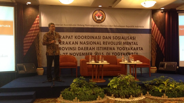 Yogyakarta, 7 Desember 2015 – Kementerian Koordinator Bidang Pembangunan Manusia dan Kebudayaan, c.q Kedeputian Koordinasi Pemberdayaan Masyarakat, Desa dan Kawasan, menyelenggarakan kegiatan Rapat Koordinasi dan Sosialisasi Gerakan Nasional Revolusi Mental (GNRM) yang dilaksanakan di Hotel Grand Quality, Yogyakarta. Kegiatan tersebut dibuka oleh Sekretaris Daerah Istimewa Yogyakarta, Ichsanuri, yang mewakili Gubernur Daerah Istimewa Yogyakarta.