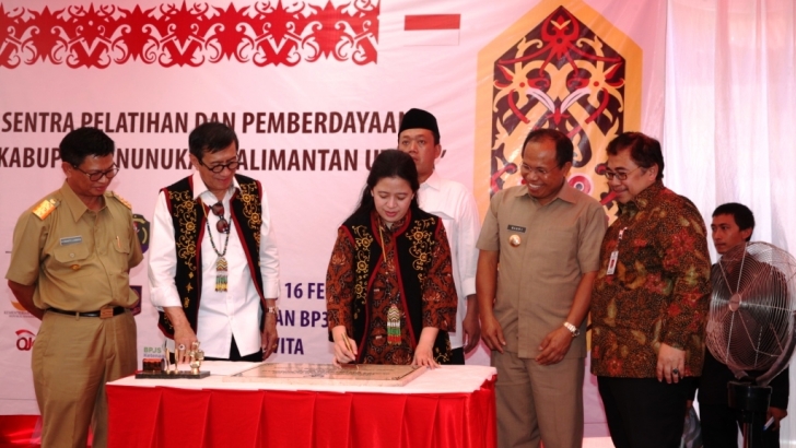 Nunukan, (16/2) - Menteri Koordinator Bidang Pembangunan Manusia dan Kebudayaan (Menko PMK) Puan Maharani didampingi Menkum dan HAM Yasonna Laoly, Kepala BNP2TKI Nusron Wahid, Gubernur Kalimantan Utara Irianto Lambrie dan Bupati Nunukan Basri, secara simbolis menandatangani prasasti Poros Sentra Pelatihan dan Pemberdayaan Daerah Perbatasan. Secara simbolis pula, Menko PMK sempat membuka tirai yang berisikan nama tempat : Poros Sentra Pelatihan dan Pemberdayaan Daerah Perbatasan.