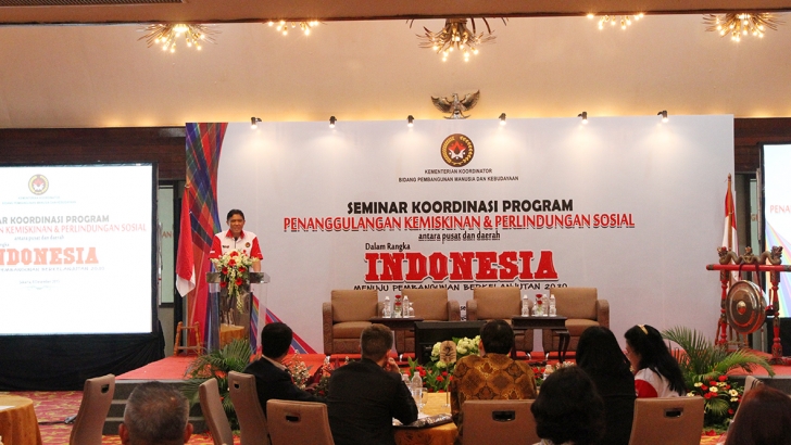 Jakarta (8/12) - Menko PMK, Puan Maharani, yang diwakili oleh Plt Deputi Menko PMK Bidang Koordinasi Penanggulangan Kemiskinan dan Perlindungan Sosial, TB Rachmat Sentika, memberikan sambutan sekaligus membuka Seminar Koordinasi Program Penanggulangan Kemiskinan dan Perlindungan Sosial antara Pusat dan Daerah dalam rangka Indonesia menuju Pembangunan Berkelanjutan 2030 di Jakarta. Acara ini menghadirkan narasumber antara lain Ketua Dewan Pertimbangan Presiden (Wantimpres) Sri Adiningsih; Penasihat Khusus Menteri Pariwisata, Sapta Nirwandar; dan Perwakilan World Bank.