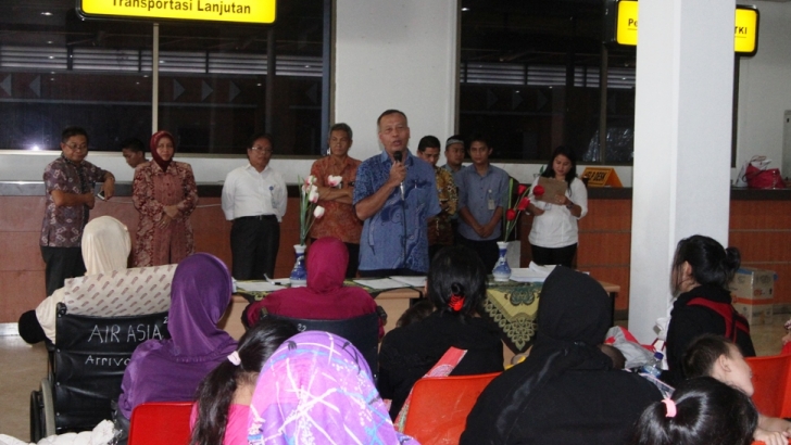 Tangerang (26/11)--- Asdep bidang Pemberdayaan Perempuan pada Kedeputian VI bidang Koordinasi Pemberdayaan Perempuan dan Kesejahteraan Anak Kemenko PMK, Wagiran saat memberikan sambutan di hadapan WNI Overstayer/TKI Undocumented hari ini di Common Use Lounge Bandara Internasional Soekarno - Hatta, Tangerang, Banten,