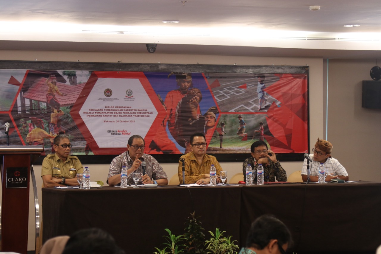 Guna mendorong percepatan pelaksanaan UU No. 5 tahun 2017 tentang Pemajuan Kebudayaan, Kementerian Koordinator Bidang Pembangunan Manusia dan Kebudayaan (Kemenko PMK) bersama Pemerintah Provinsi Sulawesi Selatan (Pemprov Sulsel) mengadakan Dialog Kebudayaan: Kebijakan Pembangunan Karakter Bangsa Melalui Pemanfaatan Obyek Pemajuan Kebudayaan (Permainan Rakyat dan Olahraga Tradisional) di Claro Hotel Makassar, Sulsel, pada Selasa (30/10). Dialog ini melibatkan akademisi, budayawan, serta profesional di bidang permainan rakyat dan olahraga tradisional. Para tamu undangan disambut tari paraga, tarian khas Sulsel yang dimainkan oleh 6 (enam) orang laki-laki berpakaian adat lengkap sambil memperlihatkan keterampilan/atraksi dalam memainkan bola raga (bola takraw).
