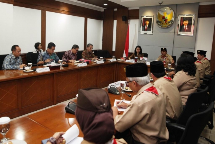 Jakarta (15/03), Menteri Koordinator Bidang Pembangunan Manusia dan Kebudayaan (Menko PMK) Puan Maharani menerima audiensi Ketua Kwartir Nasional Gerakan Pramuka, Adhyaksa Dault di ruang rapat Menko PMK, Jakarta. Turut mendampingi, Sekretaris Kementerian Koordinator Bidang Pembangunan Manusia dan Kebudayaan (Seskemenko PMK) YB Satya Sananugraha. PS