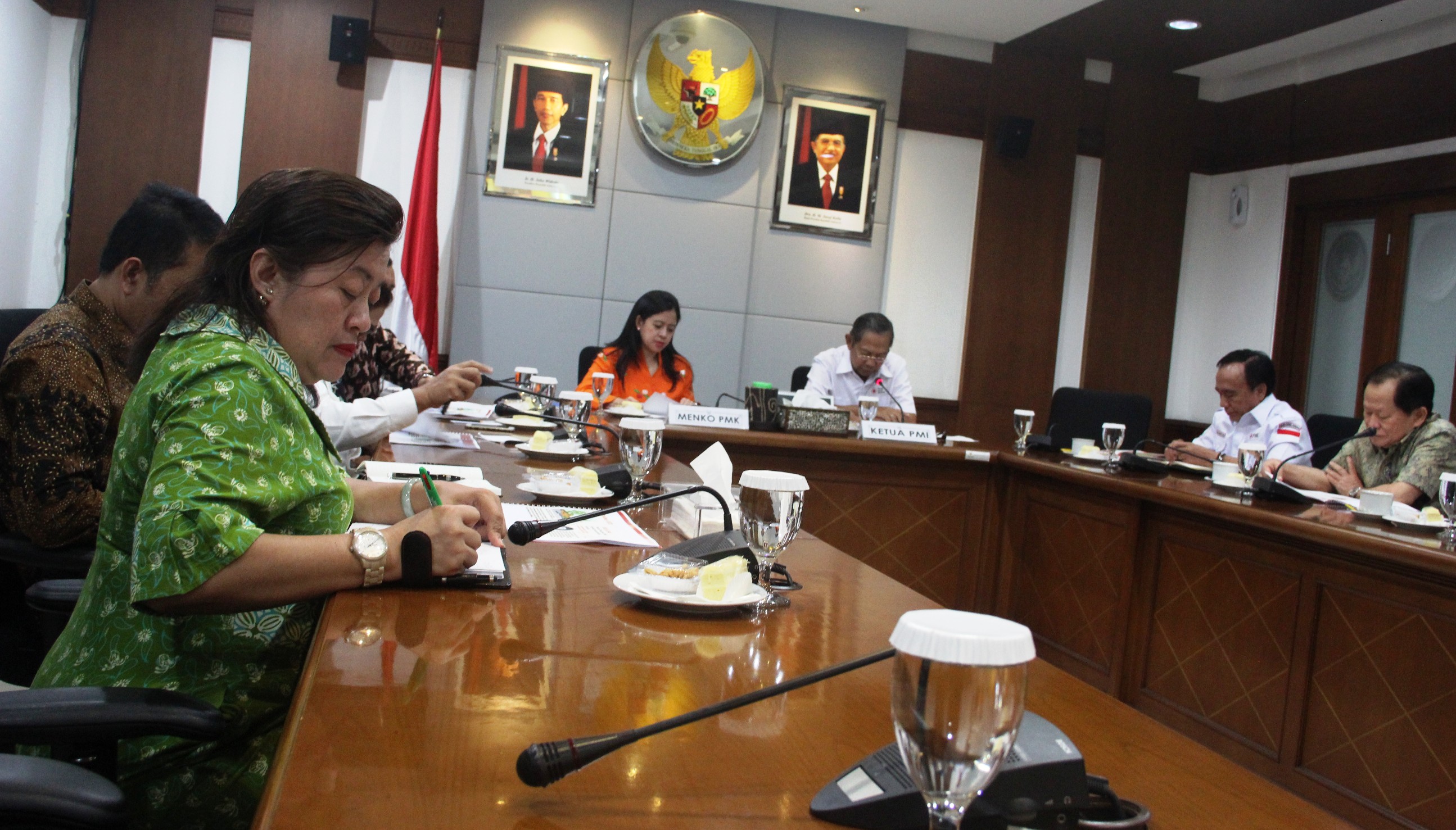 Jakarat, 05 Mei 2015 - Menteri Koordinator Bidang Pembangunan Manusia dan Kebudayaan (Menko PMK) Puan Maharani menerima audiensi Pengurus Pusat Palang Merah Indonesia yang dipimpin oleh Ketua Pelaksana Harian PMI Ginanjar Kartasasmita di raung rapat Menko PMK, Jakarta (5/5/2015). Audiensi tersebut membicarakan mengenai persiapan peringatan Hari Ulang Tahun PMI yang ke-70. (deni)
