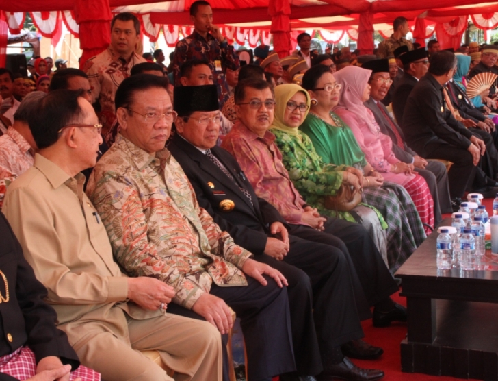 Jakarta, 22 September - Menko Kesra HR. Agung Laksono (kedua kiri)dan Menko Kesra 2001 - 2004 Jusuf Kalla dan kini wapres terpilih 2014 2019 (keempat kiri)didampingi Gubernur Sulawesi Barat H. Anwar Adnan Saleh (ketiga kiri) hadir pada peringatan Ke- 10 Pemerintah Provinsi Sulawesi Barat, Senin (22/9/2014) pagi di Lapangan Merdeka, Mamuju. Tampak hadir pula Kepala BPN Hendarman Soepandji (kiri). (Foto:Gs).