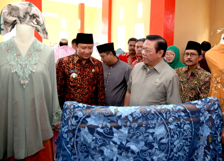 Pasuruan 16 Juli 2014 - Menko Kesra Agung Laksono didampingi Bupati Pasuruan Irsyad Yusuf (kiri) saat meninjau hasil Produk Kreatif khas Pasuruan dalam kunjungan Safari Ramdhan di Sentra Bordir dan UKM Kabupaten Pasuruan Jawa Timur.