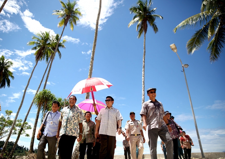 Waisai, 10 Agustus 2014 - Menko Kesra Agung Laksono (4 kiri) didampingi Wakil Menteri Kesehatan Ali Ghufron Mukti (3 kiri), Bupati Raja Ampat Marcus Wanma (2 kiri), Sekretaris Dewan Kelautan Indonesia Deddy H. Sutisna (kanan) saat meninjau persiapan Sail Raja Ampat di Pantai WTC Waisai Raja Ampat pada Sabtu siang 09/08/2014. foto:ng