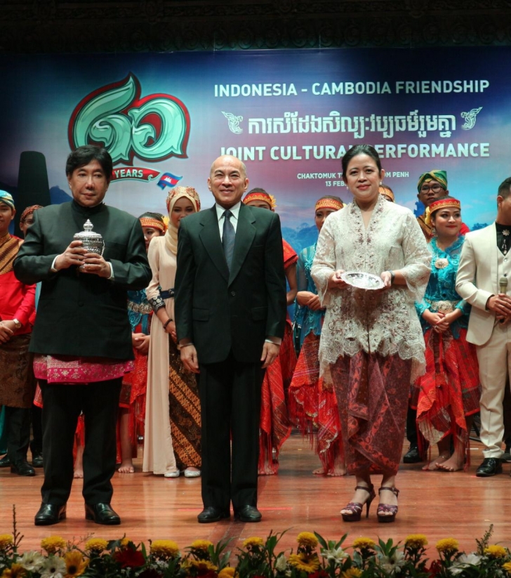 Phnom Penh (13/2) ---- Mengawali hari pertama Kunjungan Kerjanya di Phnom Penh, Kamboja.  Menteri Koordinator Bidang Pembangunan Manusia dan Kebudayaan (Menko PMK) Puan Maharani, diundang menjadi tamu kehormatan oleh Pemerintah Kerajaan Kamboja khususnya Raja Norodom Sihamoni untuk mewakili Pemerintah Indonesia pada perhelatan akbar Pagelaran Budaya 60 Tahun Hubungan Diplomatik Indonesia-Kamboja yang digelar di Gedung Chaktomuk Theatre, Phnom Penh.