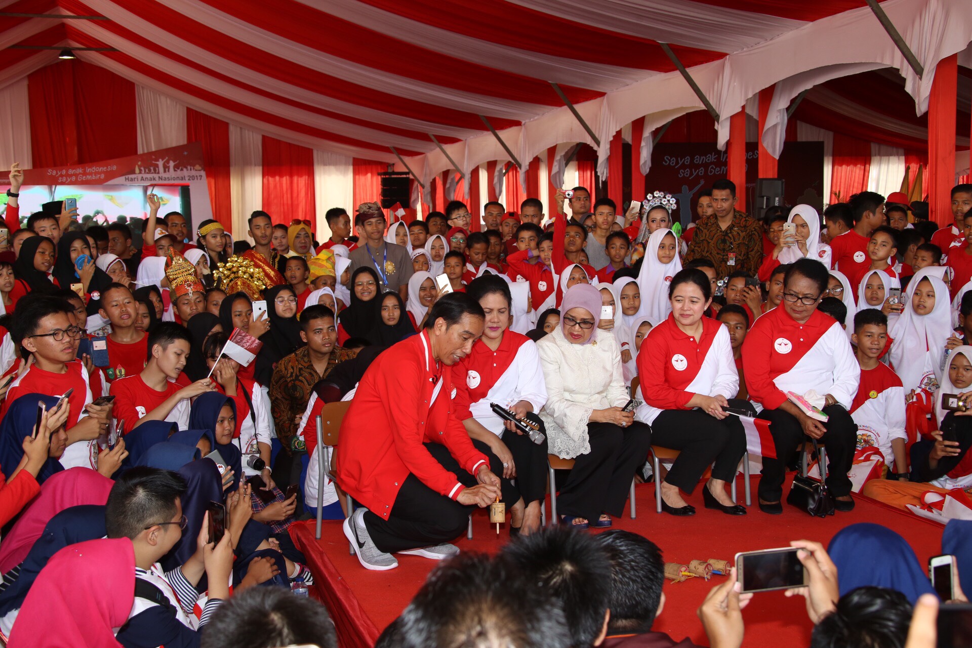 Pekanbaru, Riau (23/07)--- Bertempat di Lapangan Gedung Daerah, Kota Pekanbaru, Riau, pagi ini Presiden dan Ibu Negara, Iriana Joko Widodo, menghadiri Acara Puncak Hari Anak Nasional (HAN) 2017. Turut hadir dalam acara ini Ibu Wapres RI, Mufidah Jusuf Kalla; Menteri Koordinator bidang Pembangunan Manusia dan Kebudayaan, Puan Maharani; Menteri Pemberdayaan Perempuan dan Perlindungan Anak, Yohana Yembise; Kepala Badan Ekonomi Kreatif, Triawan Munaf; Gubernur Riau; para Kepala Daerah se-Indonesia; Sekolah semua tingkatan se-Provinsi Riau; dan media massa nasional.