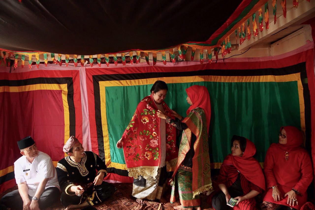 Padang, Sumbar (27/09) – Kunjungan ke Ranah Minang adalah untuk mempererat persaudaraan dan manjalang Induak Bako, demikian penegasan Menko PMK, Puan Maharani, saat menyambangi rumah gadang Datuak Kayo di Batipuh. Sebelum memasuki rumah gadang, Menko PMK dipasangkan selendang songket atau sulaman selanjutnya diundang mencicipi makan bajamba oleh Datuak Kayo dan keluarganya.