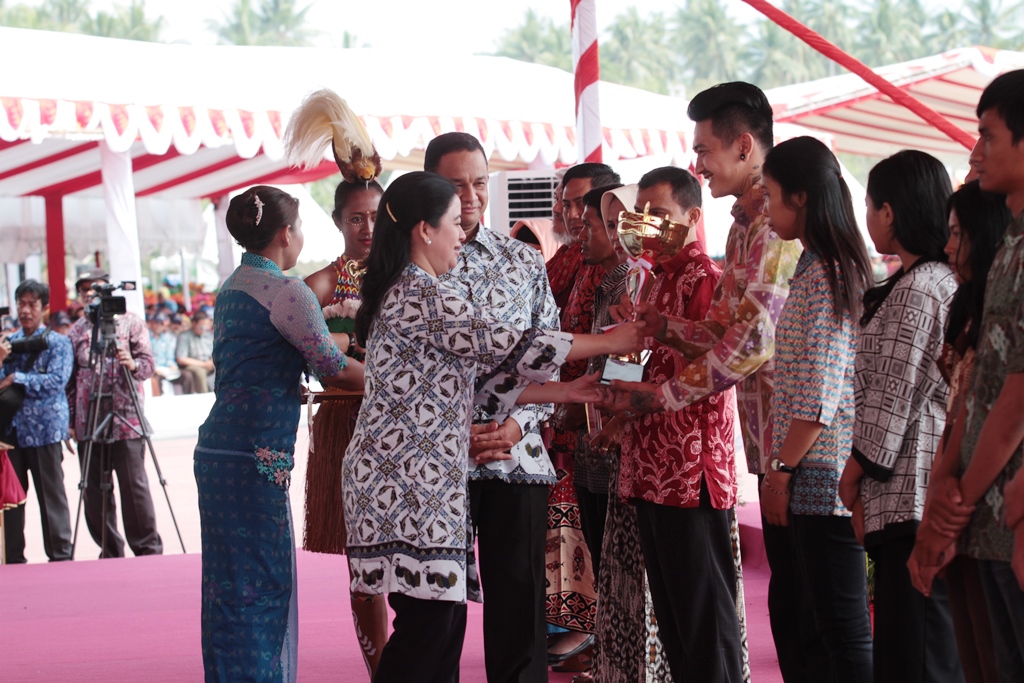 Parigi Moutong (19/8) -- Menko PMK Puan Maharani menyerahkan penghargaan kepada pemenang lomba rancang batik dalam rangka sail tomini 2015 dan pemecahan rekor muri dan dunia renang estafet terpanjang sepanjang 472 km dengan peserta sebanyak 12.679 orang selama 7 hari 7 malam kepada Bupati Parigi Moutong Samsurizal Tombolotutu sebagai perenang 50 meter terakhir. Lomba rancang batik dalam rangka Sail Tomini ini diikuti oleh putra putri bangsa dari seluruh indonesia. Hasil karya para pemenang turut dipamerkan dalam acara puncak Sail Tomini 2015. (Humas/ng)