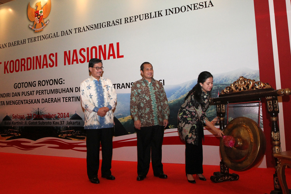 Jakarta, 23 Desember - Menteri Koordinator Bidang Pembangunan Manusia dan Kebudayaan (Menko PMK) Puan Maharani memukul gong (kanan)didampingi Menteri Desa, Pembangunan Daerah Tertinggal dan Transmigrasi Marwan Jafar (tengah) dan Menteri Agraria dan tata Ruang Ferry Mursyidan (kiri), membuka Rapat Koordinasi Nasional Kementerian Desa, PDT dan Transmigrasi, Selasa (23/12/2014) di Balai Kartini Jl. Gatot Subroto, Jakarta. (ole).