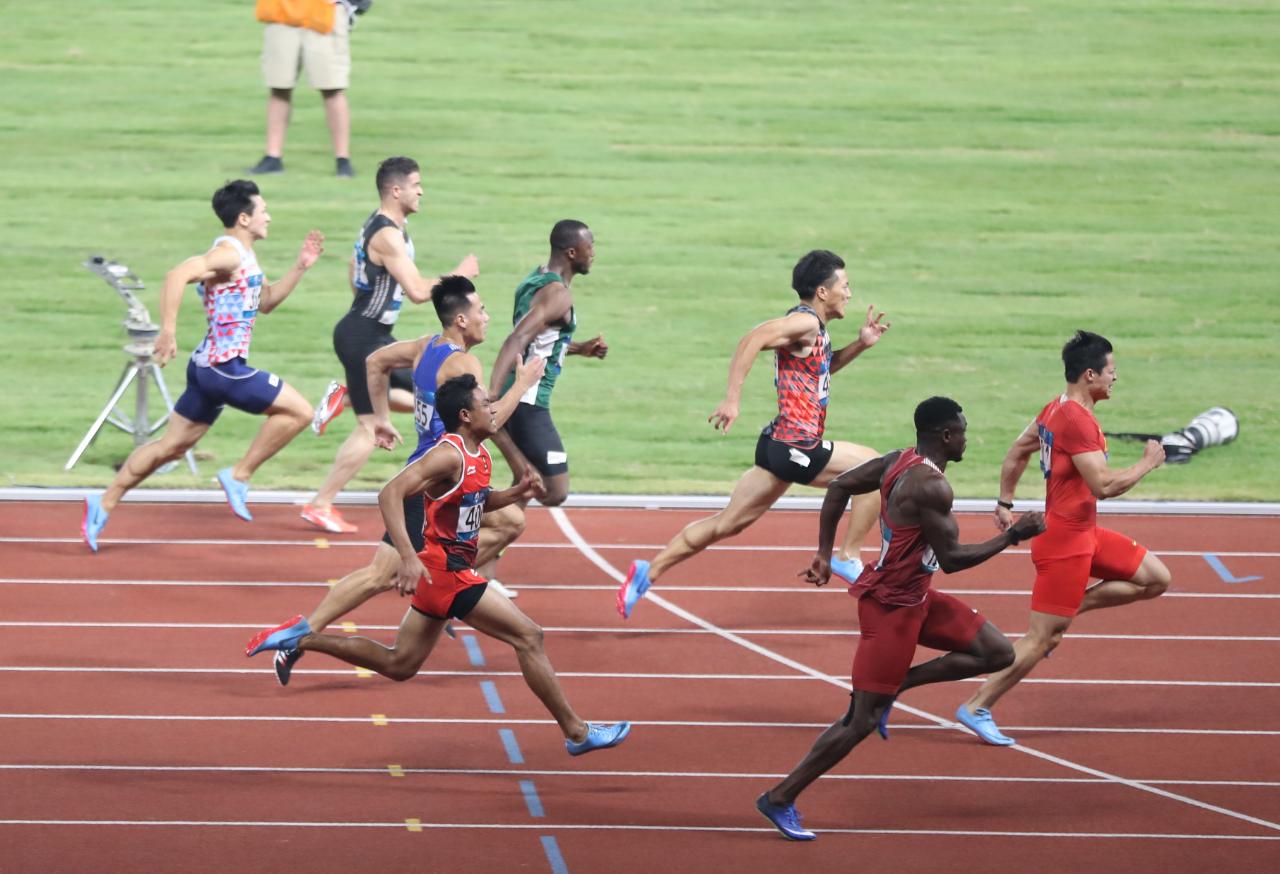 Lalu Muhammad Zohri menempati finish ke-7 dalam final lari 100 meter putra dengan perolehan waktu 10,20 detik.