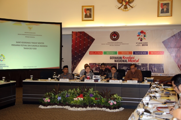 Jakarta (14/09) – Menteri Koordinator Bidang Pembangunan Manusia dan Kebudayaan (Menko PMK), Puan Maharani, pagi tadi memimpin rapat koordinasi tingkat menteri guna membahas persiapan Festival Seni Europalia Indonesia tahun 2017 -2018 di ruang rapat utama Kemenko PMK, Jakarta. Pada ratas 18 Juli 2017 lalu, Presiden Joko Widodo memberikan arahan kepada Menko PMK untuk mengkoordinasikan persiapan dan pelaksanaan Festival Seni Europalia Indonesia 2017-2018 dan memberikan arahan kepada Mendikbud serta Pimpinan K/L terkait untuk mengkaji kemungkinan diselenggarakannya event besar seperti Festival Seni Europalia ini di Indonesia.