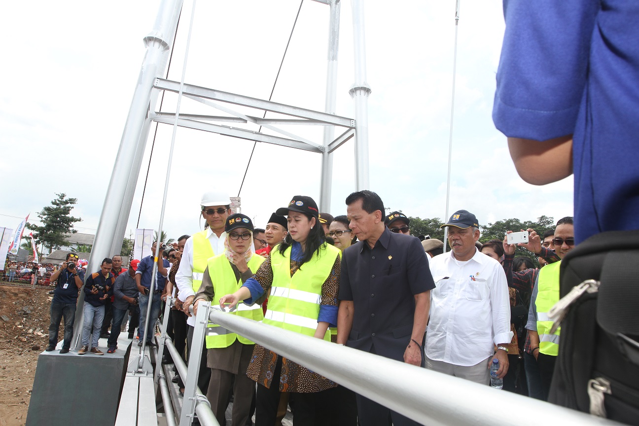 Rangkasbitung (17/2) - Menteri Koordinator Bidang Pembangunan Manusia dan Kebudayaan (Menko PMK) Puan Maharani bersama Menteri Pemberdayaan Perempuan dan Perlindungan Anak Yohana Yembise, Menteri Pekerjaan Umum dan Perumahan Rakyat Basuki Hadi Muljono, Bupati Lebak Iti Octavia Jayabaya, Anggota BPK Rizal Djalil, dan Plt Seskemenko PMK Prof Agus Sartono saat meninjau jembatan gantung Bojong Apus, Kabupaten Lebak usai meresmikan 10 jembatan gantung di Kabupaten Lebak. Hadir pula Gubernur Banten Rano Karno, Kepala BPOM Roy Sparringa, serta tokoh masyarakat setempat.