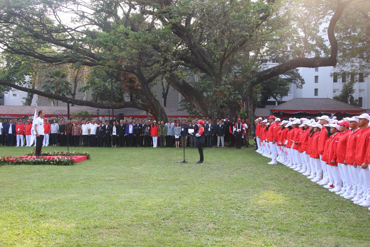 Acara pelepasan Tim Indonesia ini dihadiri juga oleh Menteri Pemuda dan Olahraga Imam Nahrawi, Menteri PUPR Basuki Hadimuljono, Ketua Inasgoc Erick Tohir, dan Cdm Komjen Pol Syafruddin.