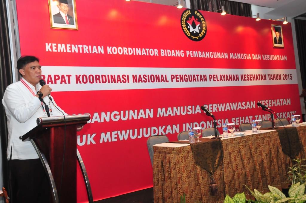 dalam sambutan yang dibacakan Deputi Rahmat Sentika , Menko PMK mengajak peserta Rakornas bersama sama menggelorakan ”Pembangunan Manusia Indonesia berwawasan Kesehatan untuk mewujudkan Indonesia Sehat tanpa Sekat”.